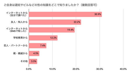 「ご自身は避妊やピルなどの性の知識をどこで知りましたか?」という設問では、「インターネットから(自分で調べた/30.9%)」が最も多く、「親・親戚から(4.5%)」が最も少ない結果に。