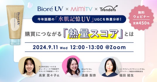 トレンダーズ株式会社(所在地:東京都渋谷区、代表取締役社長:黒川涼子、東証グロース上場:証券コード6069)が運営する美容メディア「MimiTV」は、無料マーケティングウェビナー「今年話題の『水肌記憶UV』UGCを熱量分析!購買につながる『熱量スコア』とは」を、2024年9月11日(水)に開催いたします。
