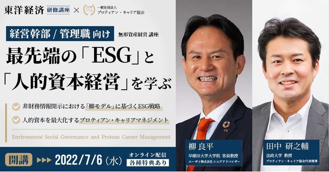 組織と個人のより良き関係性構築と個人の主体的なキャリア開発を支援する一般社団法人プロティアン・キャリア協会 (東京都新宿区、代表理事:田中研之輔・有山徹、以下、「当協会」)は、各ESG・人的資本経営領域の第一人者である早稲田大学大学院客員教授の柳良平氏と法政大学キャリアデザイン学部教授の田中研之輔が、それぞれ「ESG戦略」「人的資本最大化」について講義を行うオンライン配信を東洋経済研修講座として7月6日より販売開始したことをお伝えいたします。
