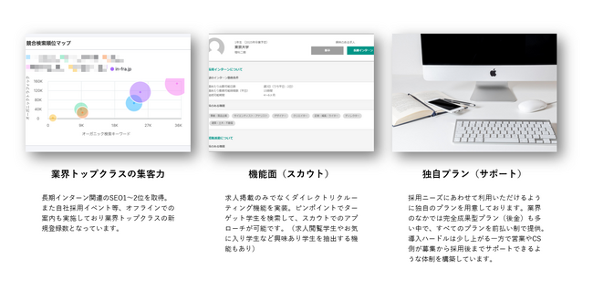 Infraインターン(インフラインターン)は国内最大級の長期インターンプラットフォームとして、多くの企業様に求人掲載していただいております。長期インターンに興味関心がある学生やインターン経験者に対して、新卒スカウトが送れるサービスも展開しており、成長意欲の高い学生を採用できる新卒採用サービスも提供しています。