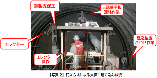 従来の鋼製支保工建て込み作業は、オペレータによる支保工把持装置(以下、エレクター)操作と、作業員による人力での位置調整を組み合わせて実施していました。【写真2参照】