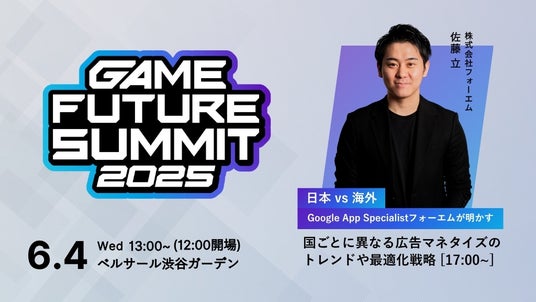 株式会社フォーエム(代表取締役:綿本 和真、以下「当社」)は、2025年6月4日(水)にベルサール渋谷ファーストにて開催されるゲーム業界最大級のビジネスカンファレンス「GAME FUTURE SUMMIT 2025」(主催:株式会社ゲームエイト、株式会社MOTTO)に登壇することをお知らせします。