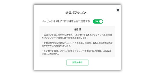 アップデートにより、テンプレート化したメッセージを送信する際に、1通ずつ数秒遅延して送信できるようになりました。