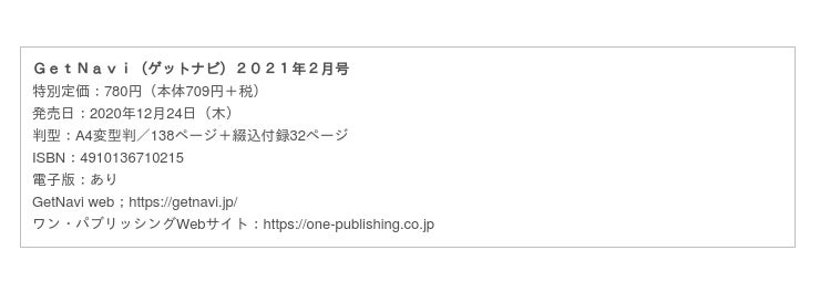 株式会社 ワン・パブリッシング(東京都台東区/代表取締役社長:廣瀬有二)は、2020年12月24日(木)に「GetNavi(ゲットナビ)2月号」(特別定価:本体709円+税)を発売いたします。