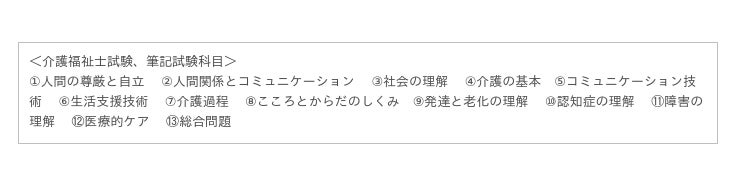 介護福祉士とは、「介護福祉士試験」に合格することで得られる介護職唯一の国家資格です。資格取得者は、多くの介護施設においてキャリアアップや待遇面での優遇につながり就職や転職でも有利に働くとされ、介護・福祉士養成校(高校・大学・短大・専門学校など)の卒業生や、介護施設での実務経験3年以上と実務者研修を修了した方などに受験資格があります。11科目の筆記試験と実技試験に合格する必要があり、合格率は例年70%前後(参考:公益財団法人社会福祉振興・試験センター「第 34 回介護福祉士国家試験の合格発表について」より)となっています。筆記試験では総得点の60%が合格の基準ですが、全科目でもれなく得点する必要がありますので、どの教科もバランスよく得点できることが合格へのカギとなってきます。
