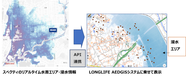 SNS上の投稿情報を1分毎の更新頻度で分析し、リアルタイムに浸水エリア、その浸水深を生成配信する「Specteeリアルタイム浸水推定図」の情報をAPI※3連携し(図1)、LONGLIFE AEDGiSシステムの地図上にヘーベルハウス・ヘーベルメゾンの、浸水状況と浸水深をビジュアルに表示します(図2)。浸水被害範囲と規模を推定し、それにより被災後の対応を効率的に行うことを目指します。