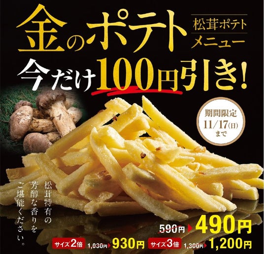 株式会社快活フロンティア(代表取締役社長:竹島 文明)は、9月30日(月)より、全国431店舗*の快活CLUBで松茸味のフライドポテト「金のポテト」を発売いたします。発売記念として、金のポテトが100円引きになるキャンペーンを9月30日(月)~11月17日(日)の期間で開催いたします。