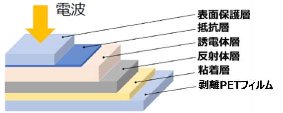本研究で開発をおこなうテラヘルツ帯送受信モジュールには、マクセルが開発したテラヘルツ波対応透明電磁波吸収シートをベースにした技術が適用されます。テラヘルツ波対応透明電磁波吸収シートは、電波が入射する側から表面保護層、抵抗層、誘電層、反射体層、粘着層、剥離PETフィルムの多層構造で構成されています。本研究では、反射体層に、より透明度の高い特殊な金属層を使用する新技術で意匠性を損なわない、高い透明性(80%超の透過率)を実現します。なおテラヘルツ波対応透明電磁波吸収シートはフレキシブル性も持ち合わせています。本技術を応用し、参画機関と連携することで、同時にテラヘルツ波帯に対応したノイズカット用フィルタの開発もおこないます。