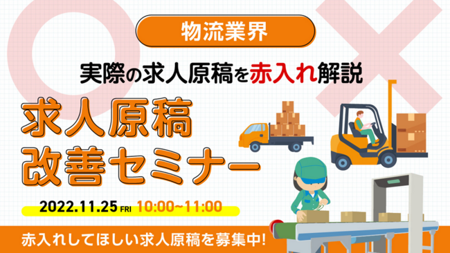 当セミナーでは、人手不足が著しい物流業界の人材採用担当者向けに求人原稿の改善について解説します。事前申し込みがあった求人原稿を赤入れし、より採用力のある表現にブラッシュアップすることで、実践的な原稿改善のポイントをお伝えします。