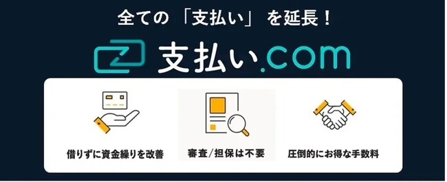 個人事業主・法人企業を対象とした「支払い.com」は、企業間の取引におけるあらゆる銀行振込のお支払いを、ユーザーがお持ちのクレジットカードで決済できるサービスです。お支払いをクレジットカードのお引落日まで延長することで、ユーザーは資金繰りの改善が可能となります。また、ユーザーは書類の提出や面談、審査は必要ありません。
