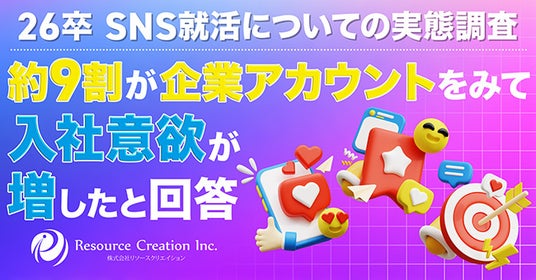SNS採用マーケティング「エアリク」を運営する、株式会社リソースクリエイション(本社:東京都港区、代表取締役:高田 桂太郎 以下 当社)は、就職活動中の学生747名を対象に、「26卒におけるSNS就活についての実態調査」(以下 本調査)を実施しました。
