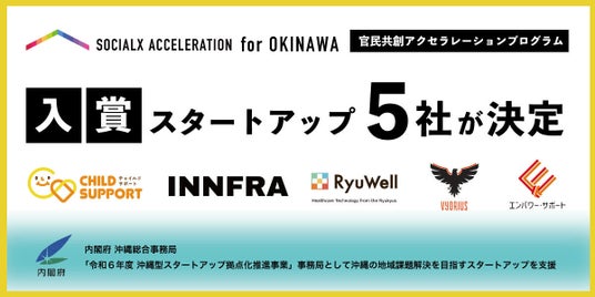 株式会社ソーシャル・エックス(本社:東京都渋谷区、以下、当社)は、1月17日に内閣府沖縄総合事務局「令和6年度 沖縄型スタートアップ拠点化推進事業(地域課題解決型スタートアップ支援事業)」事務局として、実施している官民共創型アクセラレーションプログラム「ソーシャルXアクセラレーション for OKINAWA」の最終審査を実施し、最優秀賞に株式会社チャイルドサポート、優秀賞にINNFRA 株式会社、株式会社リュウェル、審査員特別賞にヴィオリアス日本株式会社、エンパワー・サポート株式会社の5社が選ばれました。