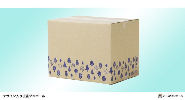 アースダンボールのデザイナーが描く、オリジナルデザイン入りの広告付きダンボール箱。アースダンボールの人気商品「広告入りダンボール箱」とは仕様が異なり、箱の外側に広告が印刷されているタイプです。