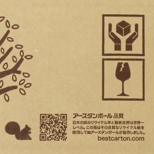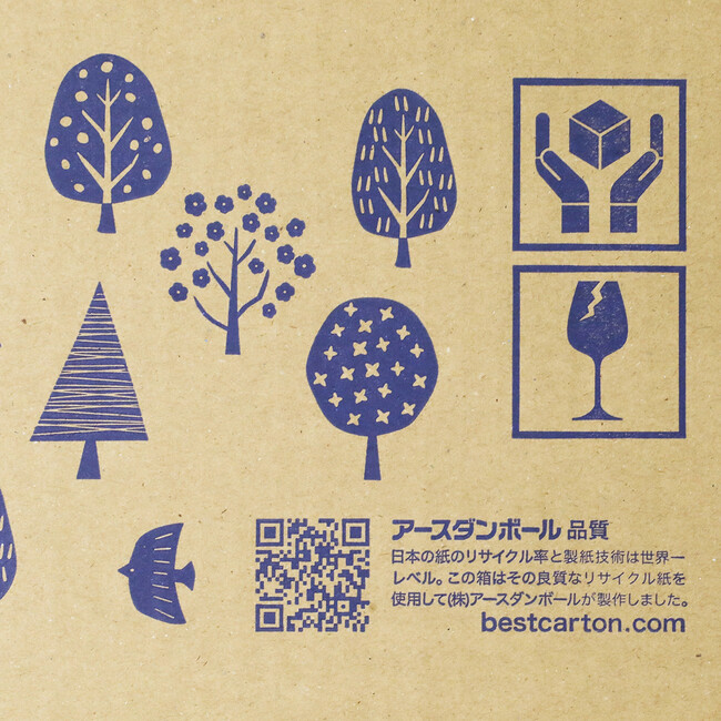 全体的に落ち着きのあるテイストで描かれているため、やさしい雰囲気を演出できるほか、側面には「取り扱い注意」「割れ物注意」のケアマークが印刷されておりますので、宅配業者さまへの荷物扱いの注意喚起としても役立ちます。