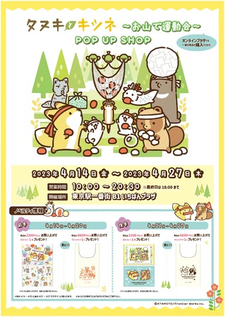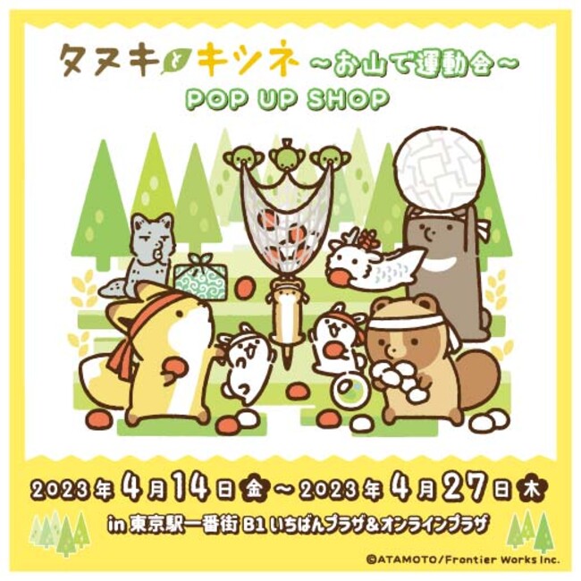 株式会社マリモクラフト(本社:東京都江戸川区)は、東京駅一番街 東京キャラクターストリート「いちばんプラザ」にて、Twitter発の大人気WEBコミック「タヌキとキツネ」のPOP UP SHOP『タヌキとキツネ~お山で運動会~』を2023年4月14日(金)から4月27日(木)までオープンいたします。