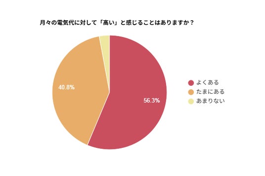 「月々の電気代に対して『高い』と感じることはありますか?」という質問では、「よくある(56.3%)」「たまにある(40.8%)」と、97.1%の方が電気代に対して高いと感じた経験があると回答しています。
