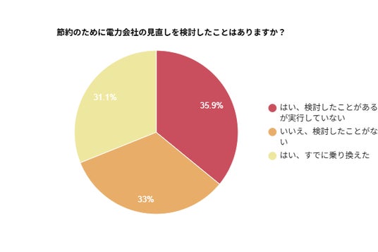 電気代の節約のために電力会社の見直しを検討したことがあり、すでに乗り換えたと答えた人は31.1%、検討したことがあるが実行していない人は35.9%で、合計67%の方が見直し経験または検討経験があると回答しました。