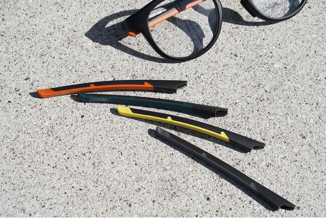 テンプルは柔軟性に富んだ素材を使用し、頭のかたちに合わせて調節をすることで包み込む様なフィット感を実現。また、鼻パッドは鼻の形状や高さに合わせて変えられる様に厚みの違う2サイズ用意し、自分に合う最適な厚みを選ぶことでフィット感が増し、激しい動きでもズレにくくなります。