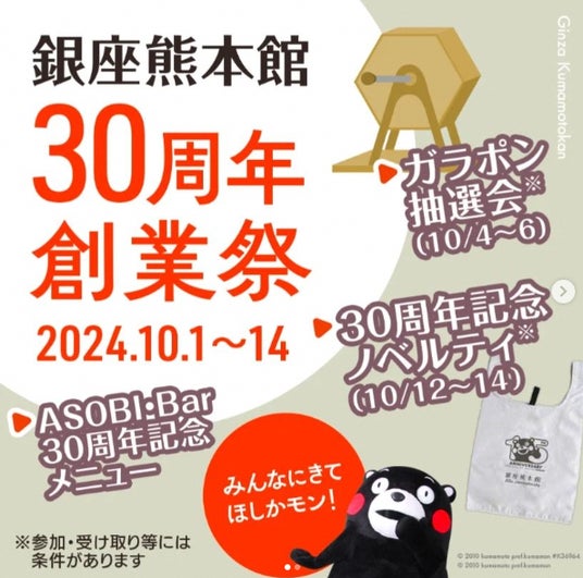 それに伴い、10月1日(火)~10月14日(月)の期間中、「銀座熊本館30周年創業祭」を開催いたします。期間中はガラポン抽選会や、数量限定のノベルティのプレゼントの他、ASOBI・Barでの特別メニューのご提供やくまモンのイラストボード原画展など、さまざまなコンテンツをご用意してお待ちしています。