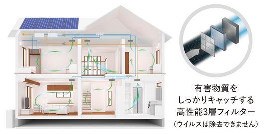 3種類の高性能フィルターを用いた換気システム「空気工房」を採用。屋外の空気中に含まれるゴミや虫、花粉や粉塵、排気ガスなどの大半をフィルターで除去したキレイな空気を室内に取り込みます(※2) 。また、給気・排気ともに機械制御し熱交換を行う第一種熱交換換気方式のため、空気の流れと量を室温の低下を抑制しながらコントロールすることが可能。室内や各部屋間の温度差が少なく、快適でさわやかな室内環境を維持します。