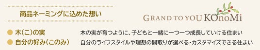 今回発売する『グランツーユー KOnoMi』は、国内の1~2階建て住宅で8割以上を占める木造住宅市場において、これらの住ニーズ・社会課題解決に応えることを目指す商品です。当社独自の工場生産技術で培った高性能な「2×6ユニット工法」をベースに、木質系住宅の魅力である「あたたかさ」「さわやかさ」「ここちよさ」が感じられる住空間を実現。一次取得者層に人気の厳選プランから選択し「自分の好み(このみ)」にカスタマイズできるため、楽しみながら理想の家づくりを進められます。「木の実(このみ)」が育つように子どもの健やかな成長を支える、子育て世帯に向けた安心・快適な住まいの提供を目指します。