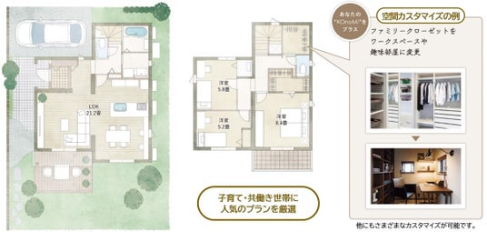 初めて家づくりを考える方でも理想の住まいを具体的にイメージしやすく、要望を伝えやすいように、子育て家族や共働き世帯を中心に人気のあるマルチスペース、ファミリークローゼット、小屋裏などの家事や収納に便利な空間を備えたプランを多数用意しました。これらは、敷地条件に合わせて厳選した建物シルエットから選択できるようになっています。また、間取りや窓の位置、住設備などはカスタマイズ可能で、よりお客様の好みに合った住まいを実現できます。