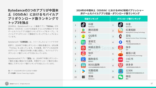 Bytedanceのショート動画アプリ『TikTok』は、2024年に中国本土(iOSのみ)における収益をさらに13%増加させ、非ゲームモバイルアプリ収益ランキングおよびダウンロード数ランキングでトップをキープしています。