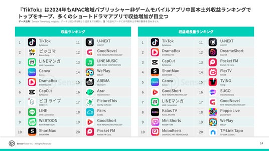 中国本土外においては、『DramaBox』『ShortMax』『GoodShort』などのショートドラマアプリの収益増加が非常に目立っており、2024年のAPAC地域パブリッシャー非ゲームモバイルアプリ中国本土外収益成長ランキングトップ20に8タイトルのショートドラマアプリが入っています。