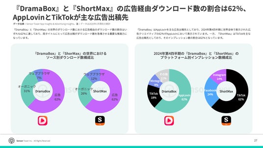 『DramaBox』と『ShortMax』のダウンロード数の急成長は広告出稿によるものであり、両タイトルの世界全体のダウンロード数に占める広告経由のダウンロード数割合はいずれも62%に達しています。『DramaBox』はAppLovinを主な広告出稿先としており、2024年第4四半期に世界全体で表示された広告クリエイティブの62%がAppLovinにおいて表示されています。一方、『ShortMax』はTikTokを主な広告出稿先としており、TikTokにおけるインプレッション数の割合は62%となっています。