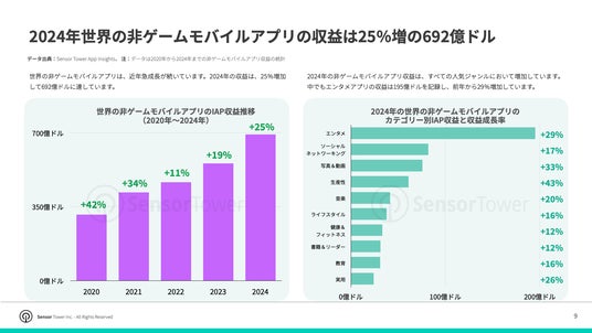 世界の非ゲームモバイルアプリ収益が急成長し続けており、2024年にはさらに25%増加して692億ドルに達しています。特に、人気ジャンルの2024年収益は全面的に増加しています。中でも収益が最も多いエンタメアプリの2024年収益は195億ドルで、前年から29%増加しています。