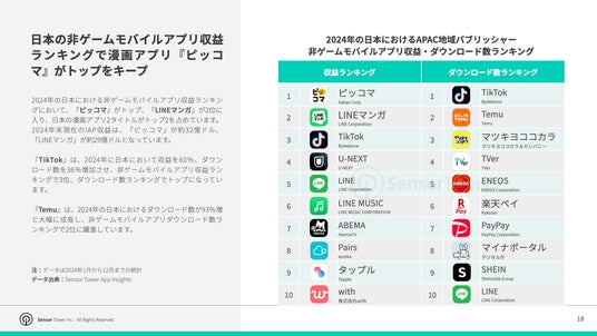 2024年の日本の非ゲームモバイルアプリ収益ランキングにおいて、『ピッコマ』がトップ、『LINEマンガ』が2位に入り、日本の漫画アプリ2つがトップ2を占めています。2024年末現在のIAP収益は、『ピッコマ』が約32億ドル、『LINEマンガ』が約29億ドルとなっています。