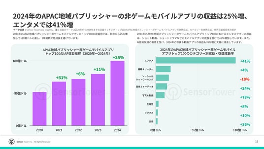 この著しい成長傾向は、APAC地域パブリッシャー非ゲームモバイルアプリの収益においても同様であり、トップ100アプリの2024年収益の合計は180億ドルに達し、前年から25%増加しています。ショートドラマ、ショート動画、AIなどのモバイルアプリの急成長を受け、APAC地域パブリッシャー非ゲームモバイルアプリトップ100のうち、エンタメアプリの収益が41%、写真&動画アプリの収益が78%増加しています。