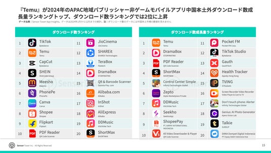 『Temu』は2024年の世界ダウンロード数が70%近く増加し、APAC地域パブリッシャー非ゲームモバイルアプリ中国本土外ダウンロード数ランキングで2位に躍進しました。また、ダウンロード数成長量ランキングではトップになっています。同アプリは、2024年にコロンビア、ブラジル、フィリピンなどの中国本土外市場の開拓に成功し、世界累計ダウンロード数が9億に迫っています。