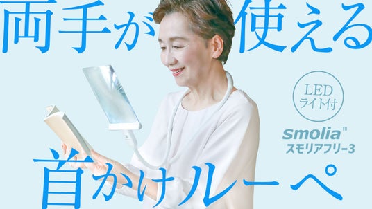 スモリアフリー3は、首にかけることで両手を自由に使える新型の拡大鏡です。この製品は、約1.8倍の拡大率を持つ、ゆがみの少ないレンズが特徴です。 球面レンズを使用しないため、ゆがみなく対象物を拡大し、細かい文字でもはっきりと読むことができます。老眼鏡と併用できるため、老眼鏡による日常的な遠近距離の視界と、それよりも更に近い距離や手元の小さい物を見るための視界をハンズフリーで簡単に得ることができます。そして、LEDライトが搭載されているため、暗い場所でも明るく見ることが可能です。また、フレームレスのデザインで、視界の妨げを最小限に抑え、軽量設計で長時間の使用でも快適です。使用スタイルは3種類あり、首掛け式・卓上スタンド式・手持ち式を自由に選んで使用可能です。 クラウドファンディング「Makuake」にて2023年11月10日から2024年1月8日まで公開されたプロジェクトで、無事に目標達成。2月6日から下記URLにて通常購入が可能になりました。
