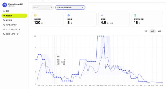 「PharmaDemand AI」は、小売薬局専用に設計されたAIネイティブ・プラットフォームです 。その核心は、「CDT (Consumer Digital Twin:消費者デジタルツイン)」モデルとPOS履歴データを融合させた独自のアルゴリズムにあります 。各店舗のSKU(最小管理単位)ごとに、将来7/30/90日間の需要変動を予測可能 。薬局経営の最優先課題である欠品リスクを解消するだけでなく、期限切れ医薬品の廃棄ロスを効果的に削減し、資産回転率を劇的に向上させます 。