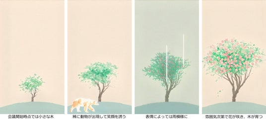 今回の実証実験では、会話や笑顔の多い会議を雰囲気の良い会議と位置づけ、会話の量に応じて木が育ち、笑顔が増えると花が咲く“木のアート”による演出を行っています。会議の雰囲気が悪いと雨が降り、時には動物が現れて笑顔を誘います。このような”木のアート”が会議の雰囲気を会議参加者にさりげなくフィードバックをすることで、会議参加者に雰囲気良く会議を進めるための“気づき”を提供します。