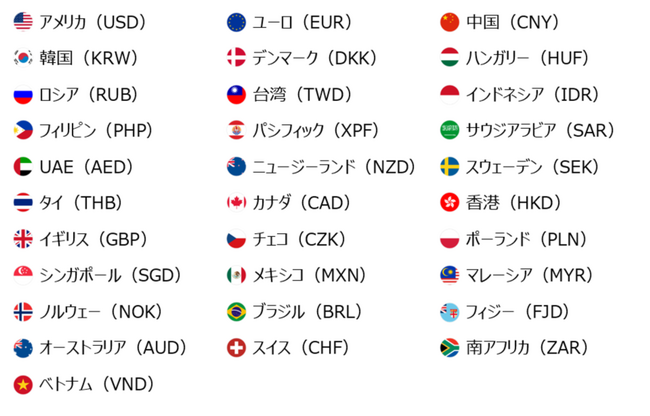 31種類の通貨をお取扱いしております。日本円→外貨、外貨→日本円への双方の両替を行っております。日本円→外貨へのご両替の場合、お支払い方法は現金はもちろん、クレジットカード(JCB、Mastercard、ライフカード)のご利用も可能です。お電話にて事前の予約も承っておりますので、お気軽にお問い合わせください。