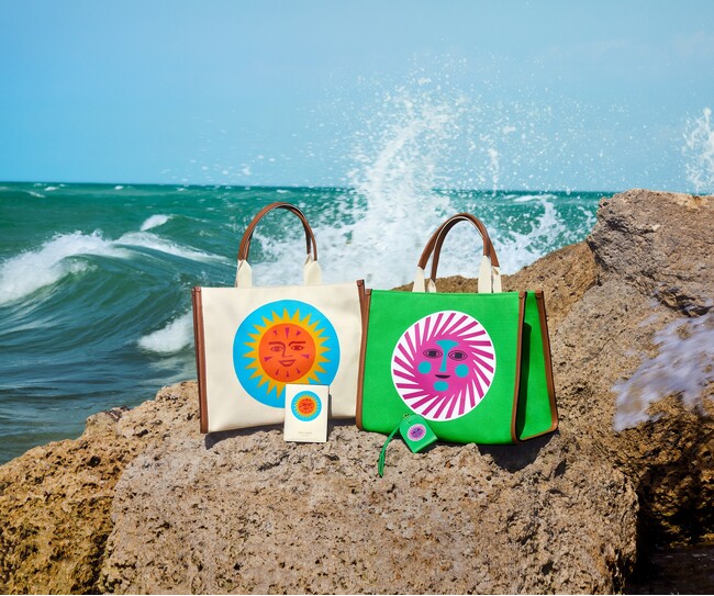 鮮やかな太陽プリントは、明るいカラーリングのラージトートから、ニットやTシャツ、そして持ち運べるアート作品としての旅行アイテムのパスポートホルダー、ラゲッジタグまでカテゴリーを跨いで展開されます。