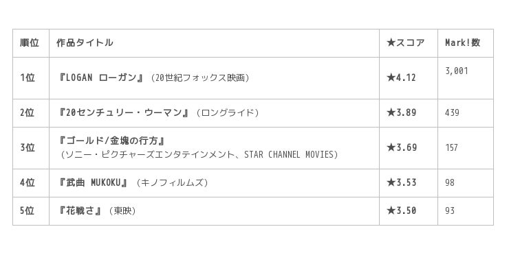 この度、Filmarksでは2017年6月第1週に上映が開始された映画を対象に、2017年6月5日時点での★スコア(映画鑑賞後に★の数で評価をしたスコア/5点満点)とMark!数(ユーザーが観た映画としてレビューを登録した数/登録は1作品につき1人1件まで)を集計。★スコアが高い作品から順に「映画初日満足度ランキング」として算出しました。