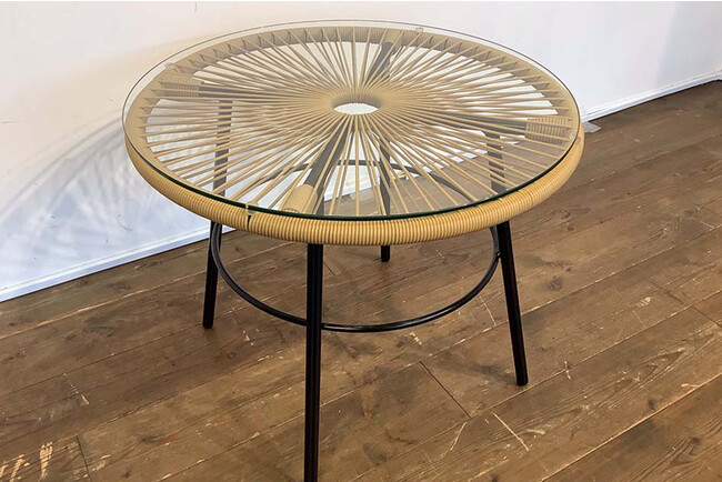 チェアに対し、やや小ぶりのテーブルも同じ素材のラタンフレームと、ガラス天板を使用しています。ガラス天板がツヤを与え、一層リゾートの雰囲気を盛り立てます。