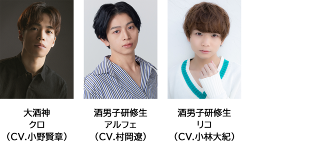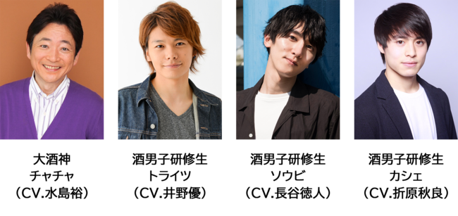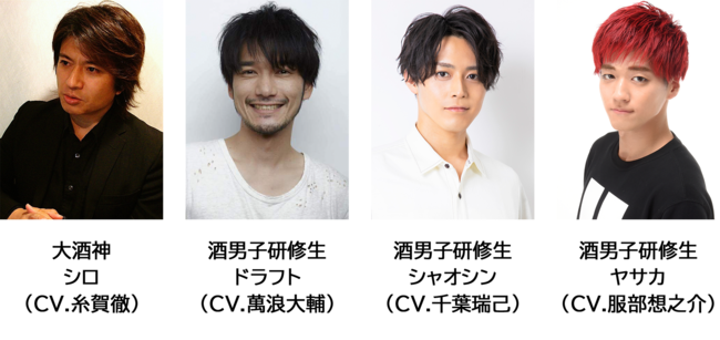 これまで酒男子チャンネルでは各チームのリーダー役であるクロ(CV.小野賢章)、シロ(CV.糸賀徹)、チャチャ(CV.水島裕)のキャストのみ公開していましたが、このたび以下の通り全酒男子研修生のキャスト情報を公開します。