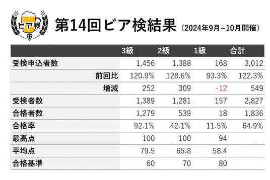一般社団法人 日本ビール文化研究会(所在地:東京都渋谷区、代表理事:菅 敏浩)は、2024年9月から10月に開催した第14回ビア検(日本ビール検定)の結果を報告します。