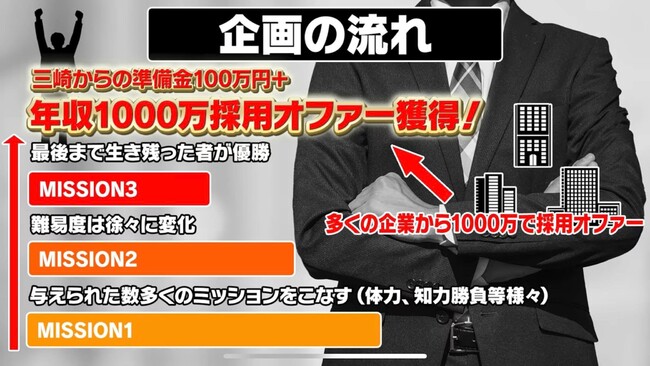 エントリーいただいた方には、Missionに挑戦いただきます。Mission3をクリアした挑戦者には、最大年収1000万円の採用オファーと三崎優太氏より就活の準備金として100万円の贈呈が行われます。
