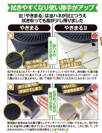 受け皿に水を入れて点火し、肉を載せると「ジュワ~」という音とともに溶けた脂が鉄板の溝から落ちていきます。肉眼でうっすら煙が見える瞬間はあるものの、ほぼ「煙は出ない」と言っていいでしょう。余分な脂が落ちるので、肉の表面がカリッと仕上がり中はジューシー。焼肉屋クオリティの味わいです! 油ハネはありますが、「やきまるII」はさっと拭き取るだけで汚れが落ちてお手入れが簡単。今から買うなら「やきまるII」がベストです。