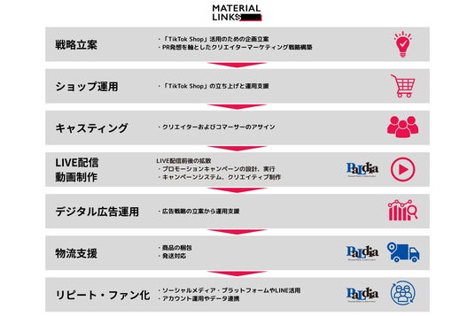 コーポレートコミュニケーションからマーケティングまでを総合的に支援するマテリアルグループ株式会社(本社:東京都港区 代表取締役CEO:青崎曹 以下:マテリアルグループ)傘下の株式会社マテリアルリンクス(本社:東京都港区 代表取締役:亀山桃子、Kevin 以下:マテリアルリンクス)は、2025年7月8日よりソーシャルメディアキャンペーンの企画・運用や物流を支援する株式会社パルディア(本社:東京都中央区 代表取締役社長:大川 祐介以下:パルディア)と業務提携を開始いたします。