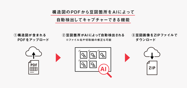 「豆図AIキャプチャー」は、構造図のPDFファイルから豆図に該当する箇所を自動で検出して、保存できる機能です。