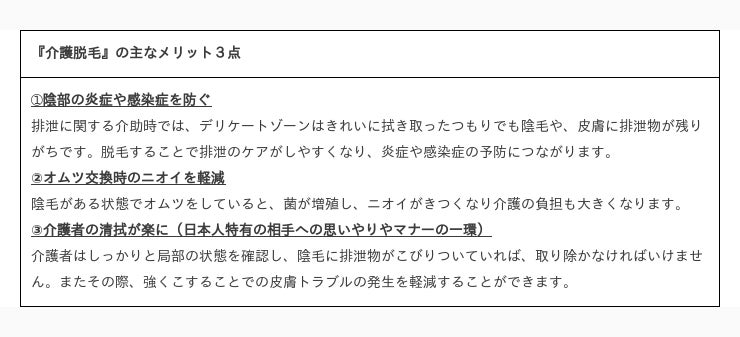 また、「長いシニア期も快適に衛生的に過ごしたい」、「もし認知症などになっても、少しでも綺麗に整えておきたい」、「最期まで自分らしく生きたい」など、アンダーヘアがない(少ない)ことで、ご自身の老後のストレスを少しでも軽減したいと、【自分自身のため】に介護脱毛を選択する中高年層が増えています。