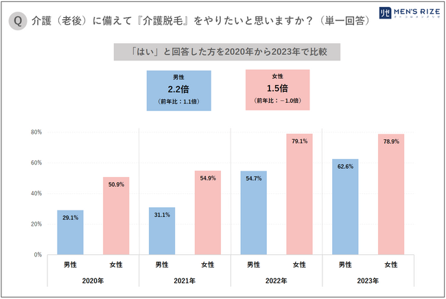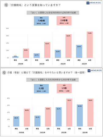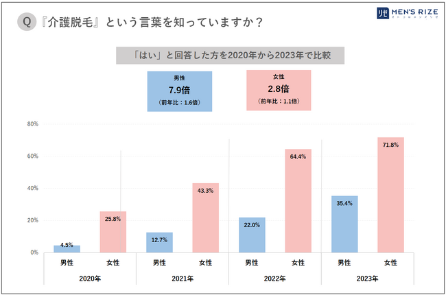 1.【「介護脱毛」の認知度】3年前と比べ、男性7.9倍、女性2.8倍へ増加