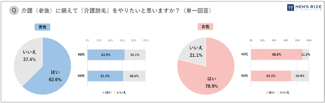 4.男性の6割以上、女性8割が『介護脱毛、希望』(男性:62.6%・女性:78.9%)※脱毛済みも含む