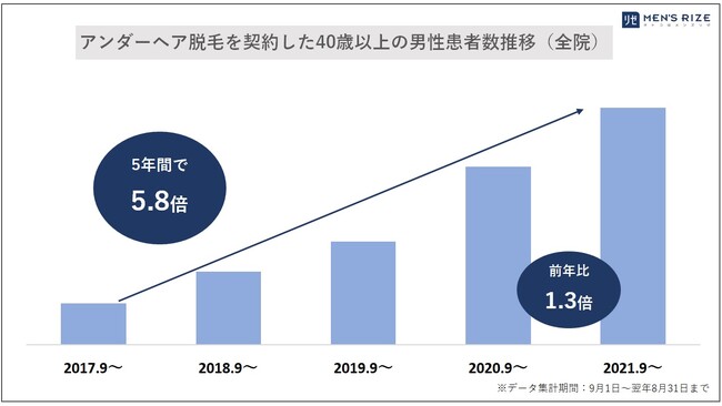 近年では『介護脱毛』の広がりもあり、ミドル世代の男性患者さまも増えつつあります。【アンダーヘア脱毛を契約した40歳以上の男性患者数(推移)】は、5 年前の「2017年9月1日~2018年8月31日」から「2021年9月1日~2022年8月31日」で比較した場合、「5.8倍(前年比:1.3倍)」と増加傾向に。